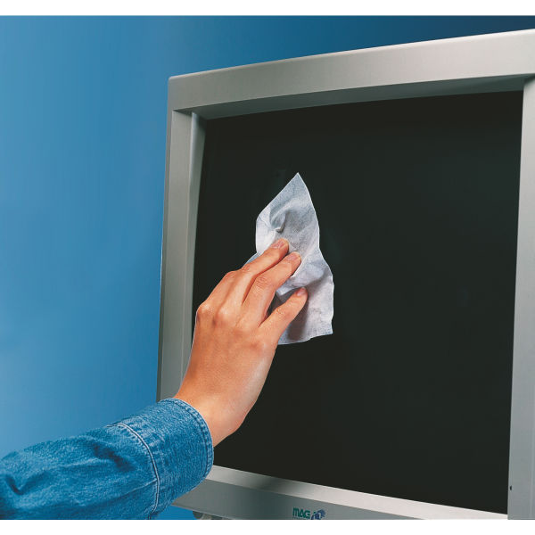 Do czyszczenia ekranów. powierzchni metalowych i szklanych. drukarek. klawiatur. telefonów i sprzętu biurowego. Formuła antystatyczna. nie rysuje powierzchni ani nie zostawia zacieków. Wilgotne i suche chusteczki w jednym funkcjonalnym i prostym w użyciu pojemniku. Zabrudzone powierzchnie należy przetrzeć wilgotną chusteczką. wysuszyć i wypolerować suchą. Sposób składania chusteczek zapewnia ich automatyczne wysuwanie.