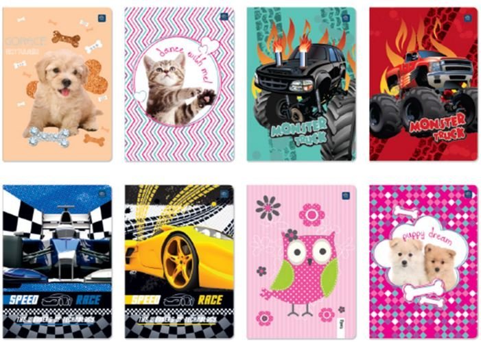 Zeszyt__okładka pokryta lakierem UV__zaokrąglone rogi (format A5)__bogata kolorystyka i duża_różnorodność wzorów okładek__jednostka sprzedaży 1 sztuka