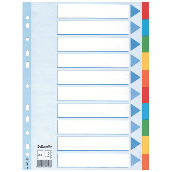 Przekładki kartonowe Esselte_- do formatu A4 lub A5_- z mocnego kartonu_- w 5 kolorach_- multiperforacja - pasuje do każdego segregatora_- z kartą informacyjno - opisową_- jednostka sprzedaży 1 komplet