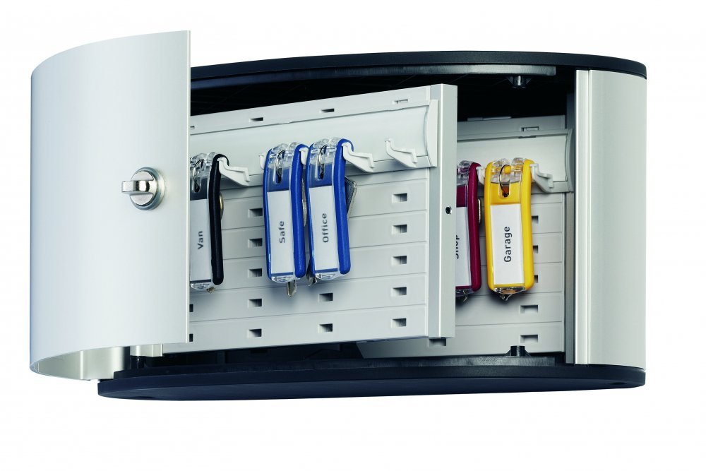 KEY BOX - skrzynki na klucze. Szafka na klucze z zawieszkami Durable_- ponadczasowe wzornictwo_- obudowa wykonana z aluminium_- każda skrzynka zamykana na zamek (w komplecie dwa klucze _ oprócz skrzynki na 12 kluczy zamykanej na rygiel)_- każda skrzynka wyposażona w woreczek z sześcioma zawieszkami na klucze w różnych kolorach. zawieszki te służą jako zapas_- w zestawie znajdują się kołki niezbędne do montażu skrzynki na ścianie_- Wielkości odpowiednio na 12. 18. 36. 54. 48 i 72 klucze._- jednostka sprzedaży 1 sztuka