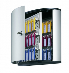 KEY BOX - skrzynki na klucze. Szafka na klucze z zawieszkami Durable_- ponadczasowe wzornictwo_- obudowa wykonana z aluminium_- każda skrzynka zamykana na zamek (w komplecie dwa klucze _ oprócz skrzynki na 12 kluczy zamykanej na rygiel)_- każda skrzynka wyposażona w woreczek z sześcioma zawieszkami na klucze w różnych kolorach. zawieszki te służą jako zapas_- w zestawie znajdują się kołki niezbędne do montażu skrzynki na ścianie_- Wielkości odpowiednio na 12. 18. 36. 54. 48 i 72 klucze._- jednostka sprzedaży 1 sztuka