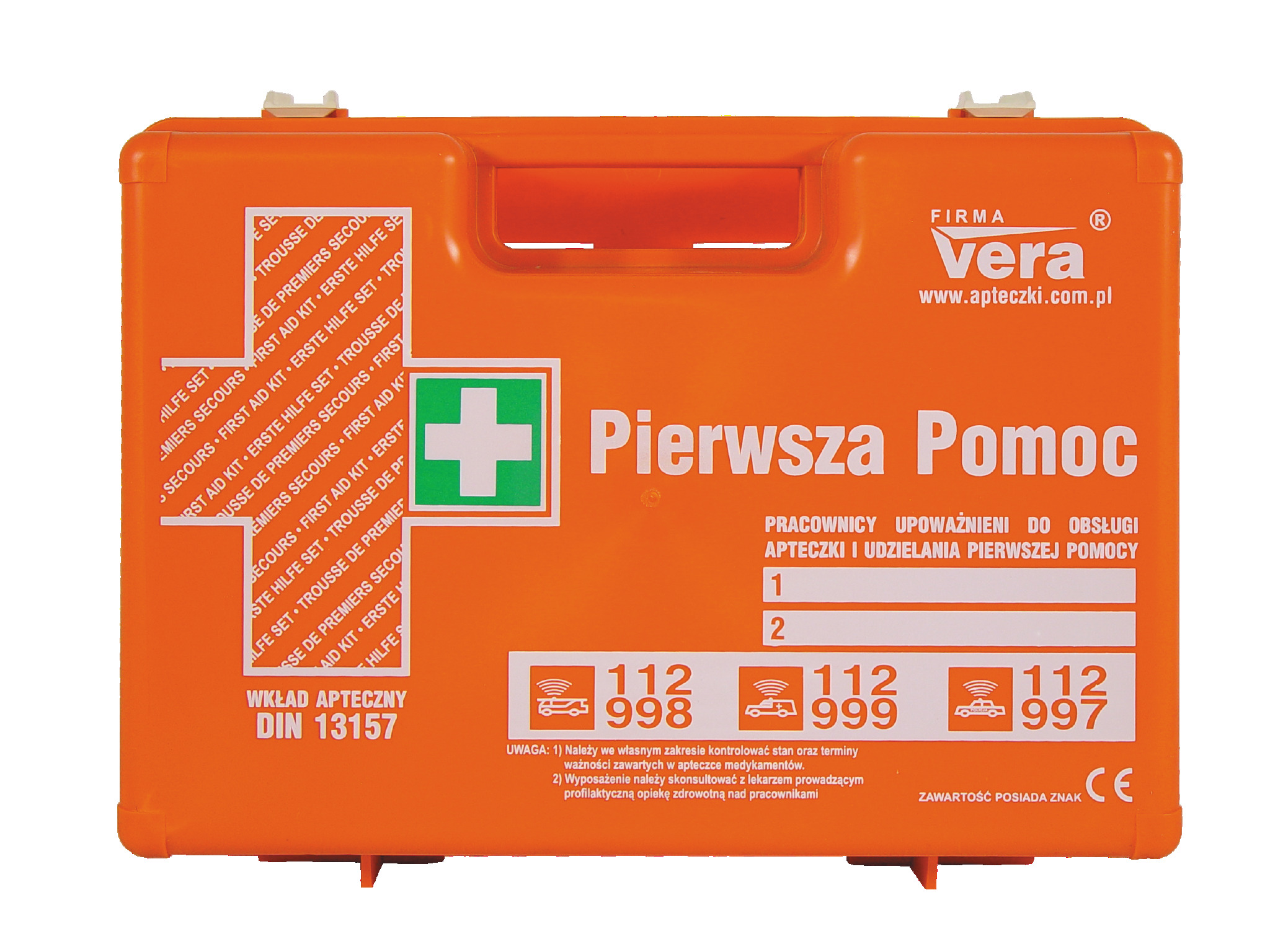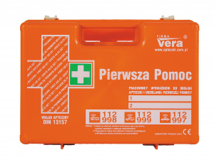 - Vera apteczka DIN 13157 top 15 + - wymiary apteczki: 330x235x125 mm - kolor pomarańczowy - stelaż mocujący do ściany- skład apteczki: kompres zimny. 2 kompresy na oko.3 kompresy 10x10 cm. 2 opaski elastyczne 4mx6cm. 2 opaski elastyczne 4mx8 cm. 8 sztuk plastrów 10x6 cm. zestaw plastrów 20 sztuk. przylepiec 5mx2.5 cm. opatrunek indywidualny G. 3 szt. opatrunek indywidualny M. opatrunek indywidualny K. chusta opatrunkowa 60x80 cm. 2 szt. chusty trójkątne. chusta z fiseliny (5 szt.). koc ratunkowy 160x210 cm. nożyczki 19 cm. rękawice winylowe 4 szt.. 2 worki foliowe 30x40 cm. chusteczki dezynfekujące 6 szt. ustnik do sztucznego oddychania. instrukcja udzielania pierwszej pomocy wraz z wykazem telefonów alarmowych.
