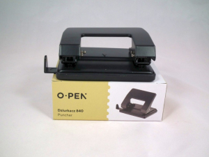 Dziurkacz metalowy z gumową podstawą antypoślizgową. Dziurkuje do 25 kartek. Rozstaw otworów 80mm. Średnica otworu 6mm. Wyposażony w listwę formatową. Pojemnik na ścinki w podstawie. Kolor czarny.
