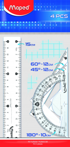 Geometryczny zestaw linijek START w skład którego wchodzą: linijka 15 cm. ekierka 45°-15cm. ekierka 60° -15cm. kątomierz 180°-10 cm . Linijki są bardzo wysokiej jakości. wykonane z krystalicznie przezroczystego tworzywa sztucznego. Nadruk na skali wykonany jest tuszem odpornym na promienie ultrafioletowe co zabezpiecza przed płowieniem. Pudełko 100 sztuk. JS 1 sztuka.