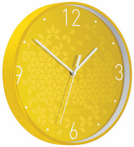 Element kolekcji Leitz WOW oferującej szeroki wybór stylowych produktów biurowych dostępnych w przykuwających wzrok kolorach i wyrafinowanym wzornictwie. które pozwoli Ci wyrazić swoją osobowość. Zaprojektowane z myślą o osobach pracujących w biurach lub często przemieszczających się_Średnica tarczy 29 cm_Cichy. kwarcowy mechanizm_Konstrukcja z solidnej. plastikowej. dwukolorowej ramy ze szklanym frontem_Tarcza z geometrycznym wzorem w kolorach WOW i dużymi cyframi_Trzy czarne wskazówki zegara są dobrze widoczne na tle tarczy_Z wygodnym otworem do zawieszania_Działa na 1 baterię AA (niedołączana do zestawu)