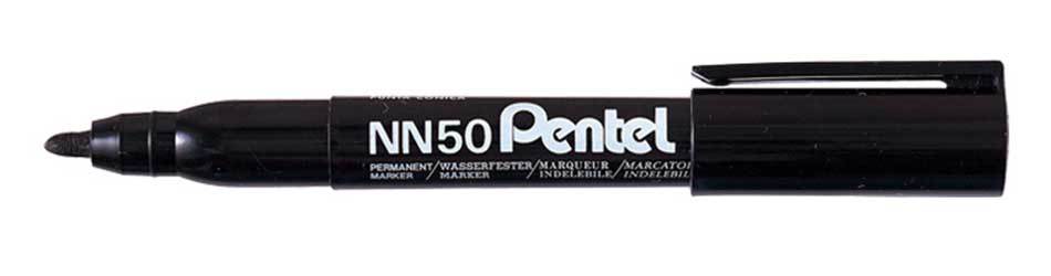 Marker permanentny Pentel _- Okrągła końcówka (NN50). Nadaje się na każdą powierzchnię. z wyjątkiem ważnych dokumentów i białych tablic (nieodpowiedni tusz). Długość linii pisania 570m. Grubość linii pisania 1.07mm Produkt wykonany w 85% z materiałow przetworzonych._- jednostka sprzedazy 1 sztuka
